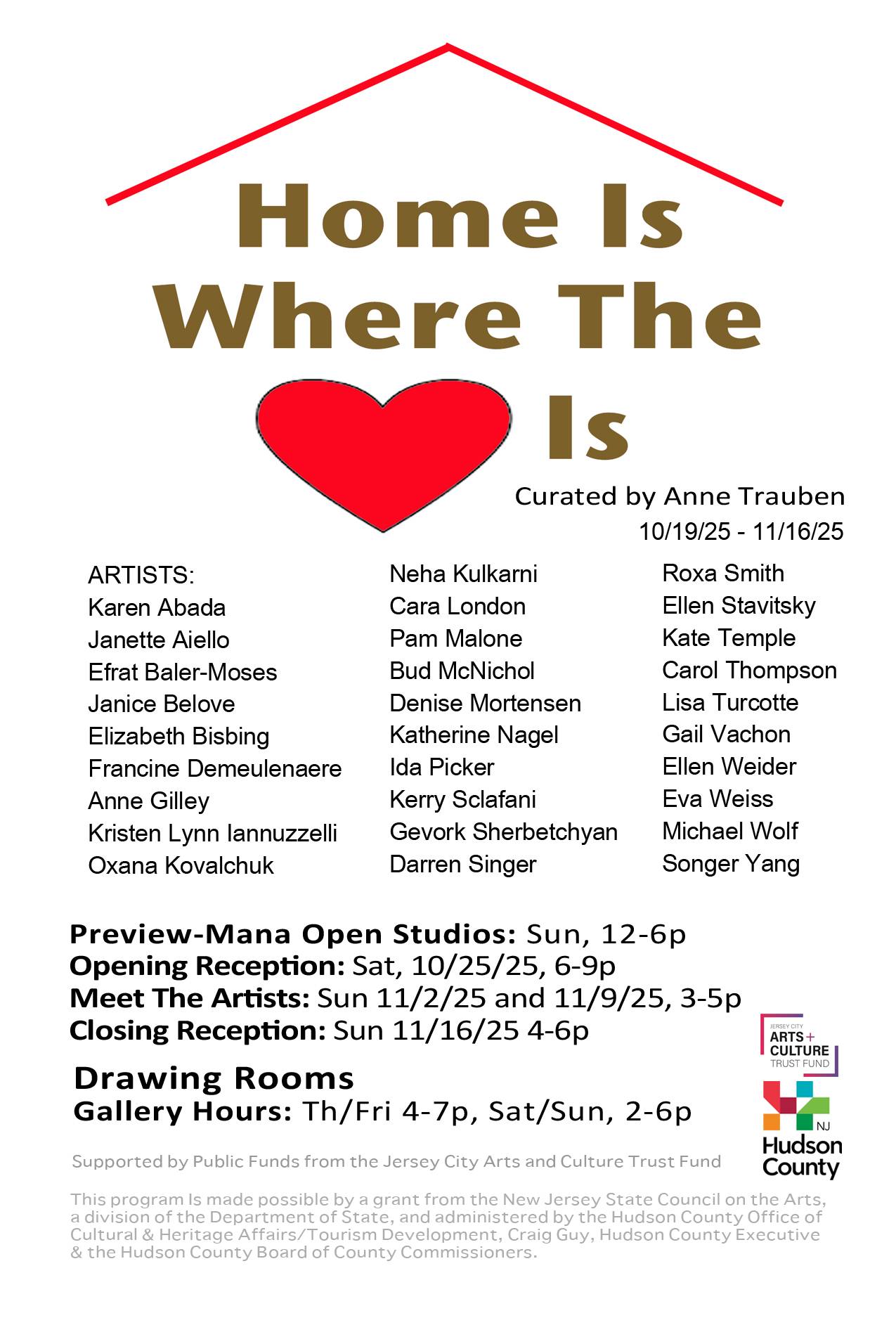 Opening Reception Sat 10/25/25, 6-9p Home is Where the Heart Is /Drawing Rooms Solo Project Space /Abstraction in the Alcove Gallerysee moreCONSTRUCTION CLOSURES ON NEWARK AVE. THIS WEEKEND! TRAVEL ISSUESWe have just been made aware that our block is closed all weeend for construction! If you are taking the TRAIN/WALKING: Please be careful while walking on Newark Ave through construction. Keep right and you'll find our front door entrance.If you are DRIVING:The Back Entrance to the parking...
